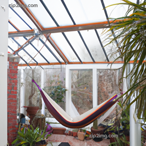 An orangery during the winter months with a hammock inside hanging from the ceiling.