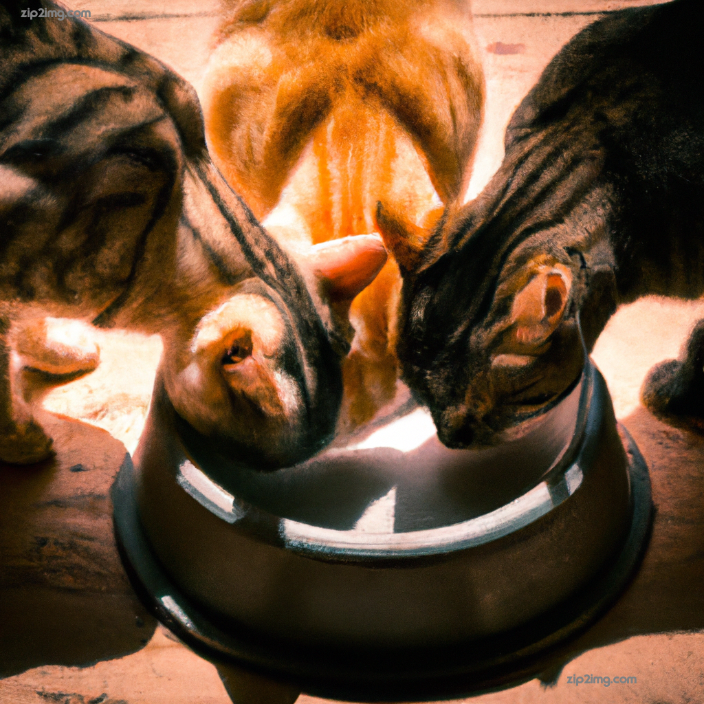 A warm color photograph of three cats sharing a waterbowl